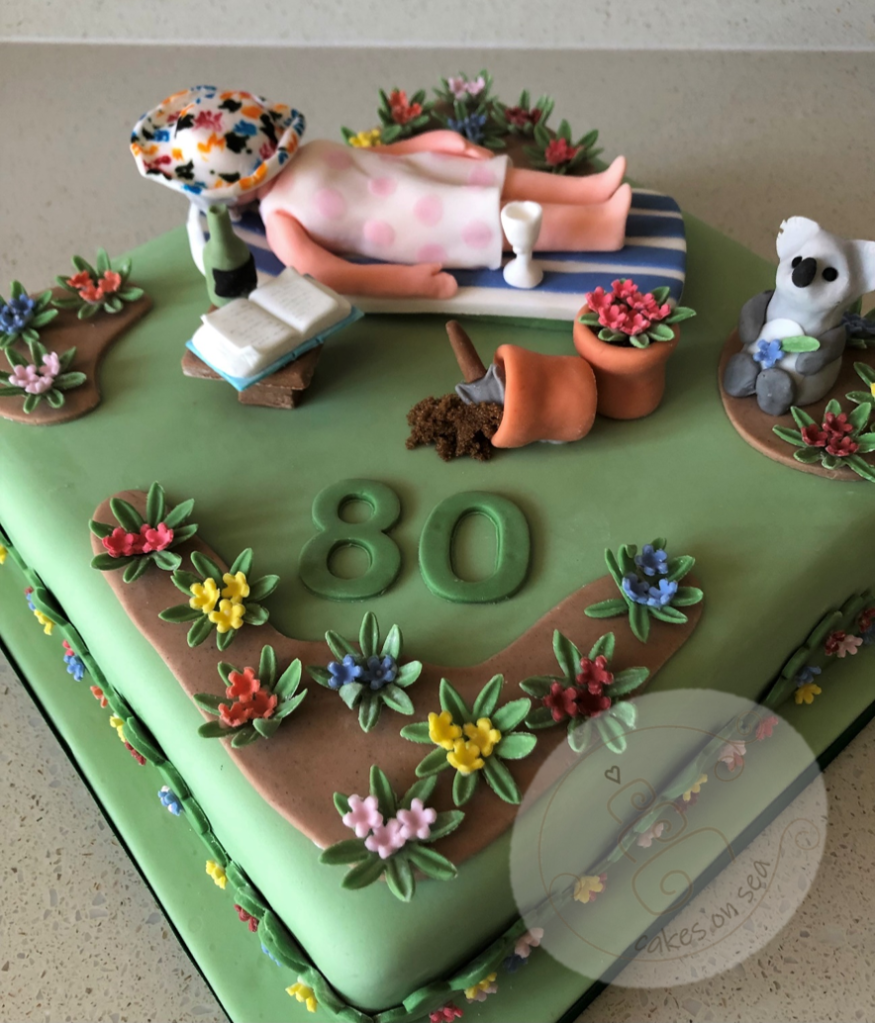 Margaret had a big birthday last weekend. She loves her garden, particularly relaxing on her sun lounger with a good book and a glass of wine. Her daughter explained that part of the family live in Australia and she asked if I could make a little sugar koala to sit in the flowerbed to represent them. Underneath all this is a big chocolate fudge cake, enough for all Margaret’s friends and family to share. Happy birthday Margaret.