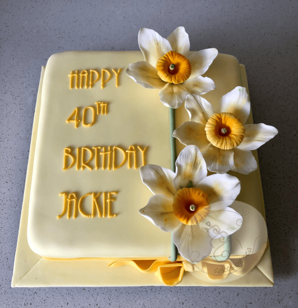 Spring daffodils May 28, 2022 ~ Liz Here is a cake for Jackie’s spring birthday. Lemon sponge layered with buttercream and fresh lemon curd lies inside this pretty cake with hand made sugar daffodils. I know your dad couldn’t join you but I hope your delayed celebration went well. Share this: Click to share on X (Opens in new window) X Click to share on Facebook (Opens in new window) Facebook Like Loading... Related