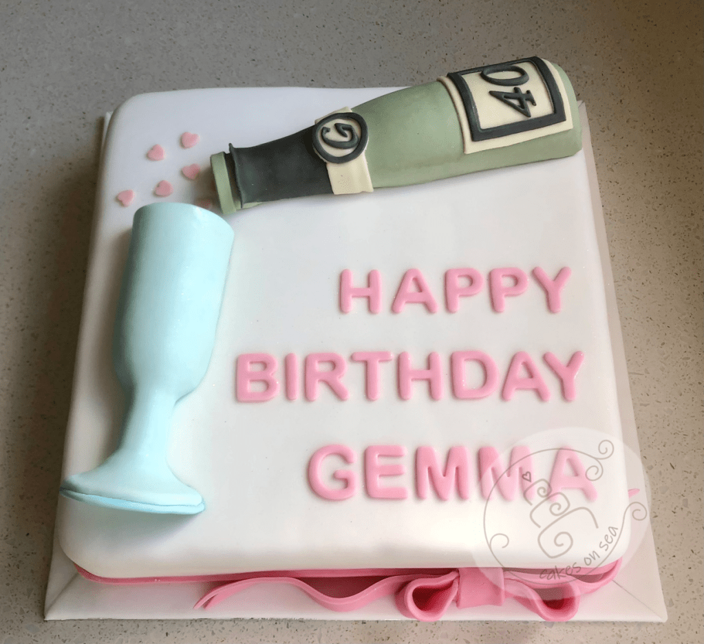 So Gemma has reached the big 40. what better way to celebrate than with a glass of champagne? This is a vanilla cake filled with jam and buttercream topped with a sugar bottle and glass. All edible, cheers!