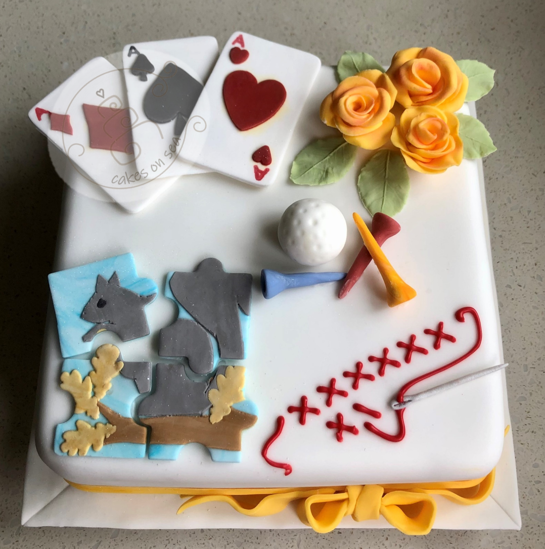 This is a cake that I made to commemorate the long and happy life of a very special lady who passed away earlier this year. Her family gathered from far and wide to remember her together. She had a wealth of interests but especially golf, bridge, her garden, embroidery and jigsaws. She was well known for her intolerance of squirrels, so I sneaked one on as the picture on the puzzle. Every last bit edible of course.