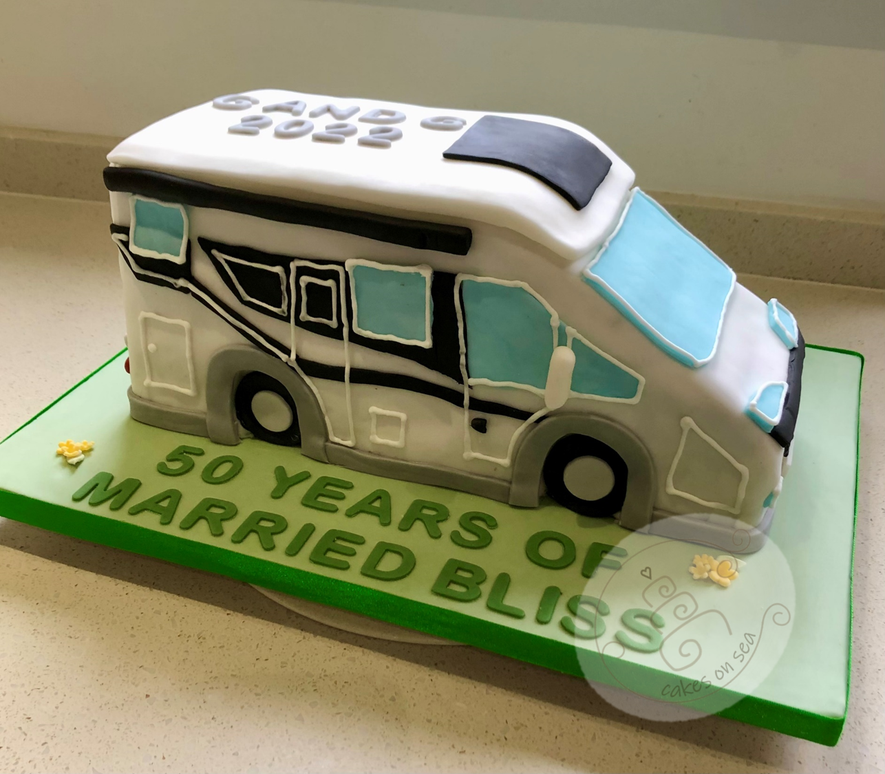 Liz and Richard had an extended golden wedding celebration taking their family and friends away for a weekend in Dorset. They wanted a big cake to keep everyone going for the whole holiday and asked me to make it in the shape of their campervan. (I don’t think they stuffed everyone in it this time). Anyway, this is a huge chocolate cake iced as a rough representation of their vehicle. Vaguely recognisable I think and delicious I hope. Have fun everyone