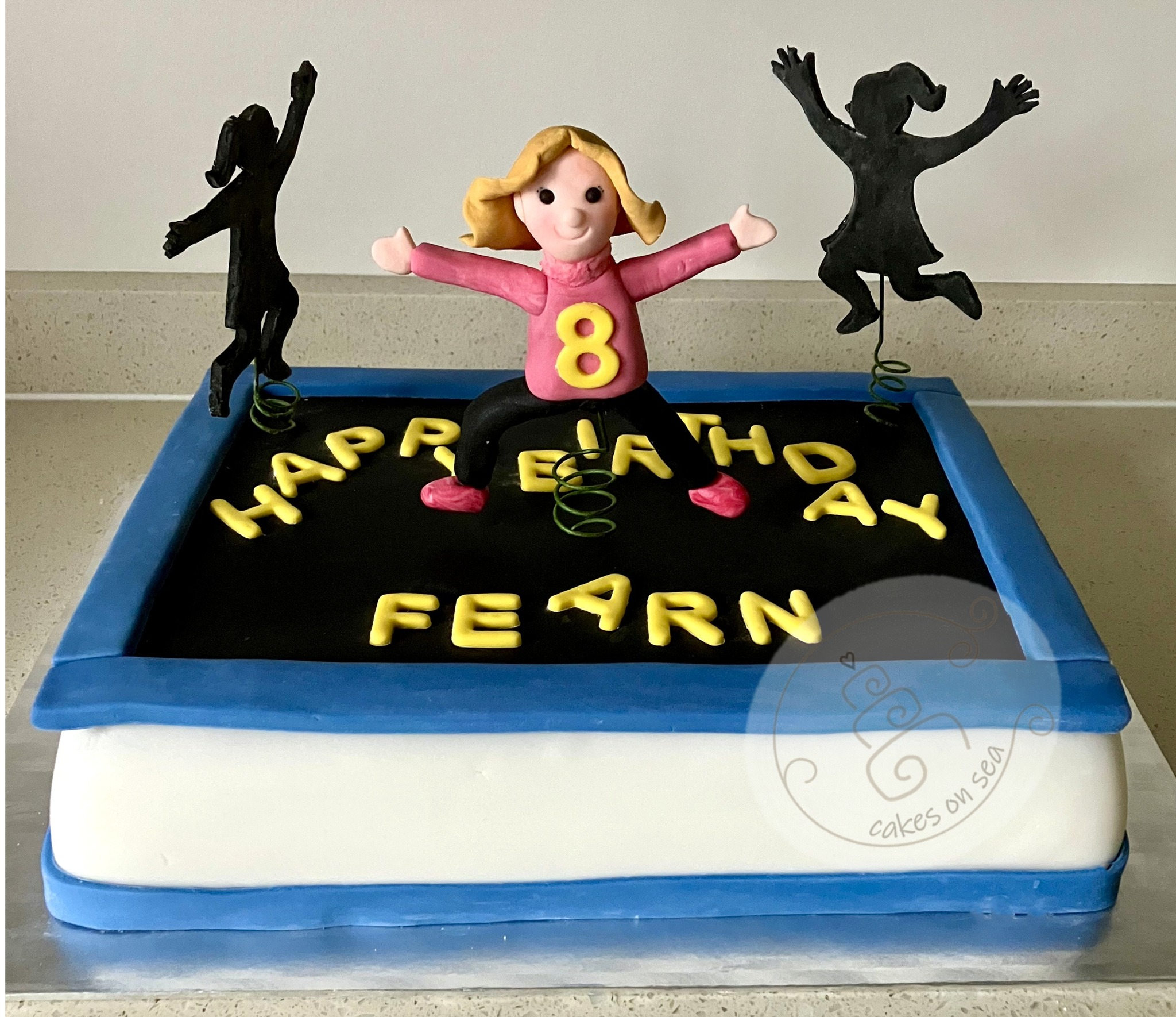 Fearn had a trampolining party to celebrate her birthday this year. Here is a jam and buttercream sponge trampoline cake with a model of Fearn jumping in the middle of it. I hope you had a lovely time Fearn, I can’t believe you are eight – it seems only yesterday that I was putting Peppa Pig on your third birthday cake!