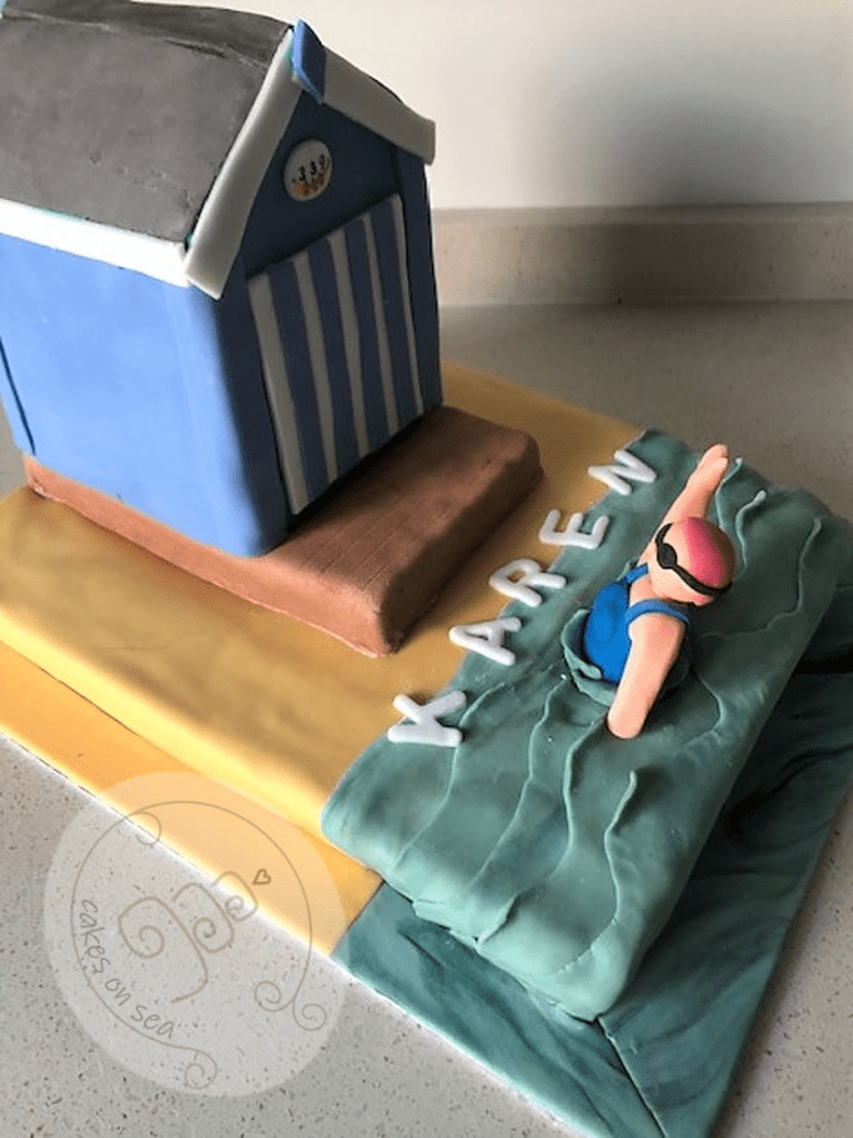 Karen is a seasoned, highly experienced sea swimmer and has a lovely beach hut at Milford from which to leap into the freezing foam. Her husband was hoping to organise an ‘open hut’ day for her birthday but the terrible weather forced some last minute rearrangements. Never mind, this is a chocolate cake filled with dark chocolate ganache, shaped and iced to form a (rough) replica of their little seaside haven, complete with sand and sea. The ‘decking’ under the hut is a gluten free brownie, just in case (delicious whether you ned to be gluten free or not). I really hope you had a lovely day Karen, who cares about a little bit of damp? Just eat cake!
